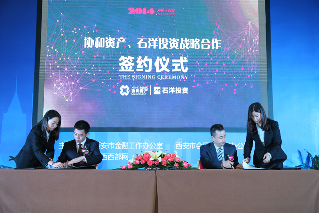 10月12日,陜西石洋投資管理有限公司(石洋投資)與陜西協(xié)和資產(chǎn)管理有限公司(協(xié)和資產(chǎn))戰(zhàn)略合作簽約儀式在“2014中國•西安金融產(chǎn)業(yè)博覽會(huì)”主會(huì)場曲江國際會(huì)展中心隆重舉行。石羊集團(tuán)董事長魏存成、協(xié)和控股董事長成建禮出席并見證簽約儀式,雙方其他領(lǐng)導(dǎo)和嘉賓共同參加了會(huì)議。